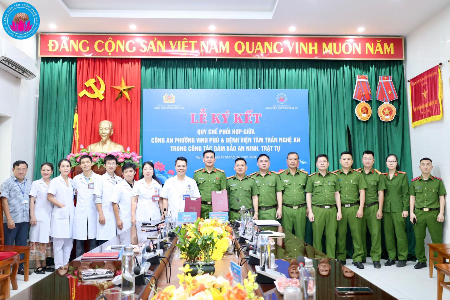 Nhằm thắt chặt mối quan hệ phối hợp, nâng cao hiệu quả công tác đảm bảo an ninh trật tự (ANTT) và tạo môi trường an toàn cho công tác khám, chữa bệnh, chiều ngày 13/4/2026, Công an phường Vinh Phú và Bệnh viện Tâm thần Nghệ An đã chính thức tổ chức Lễ ký kết Quy chế phối hợp.